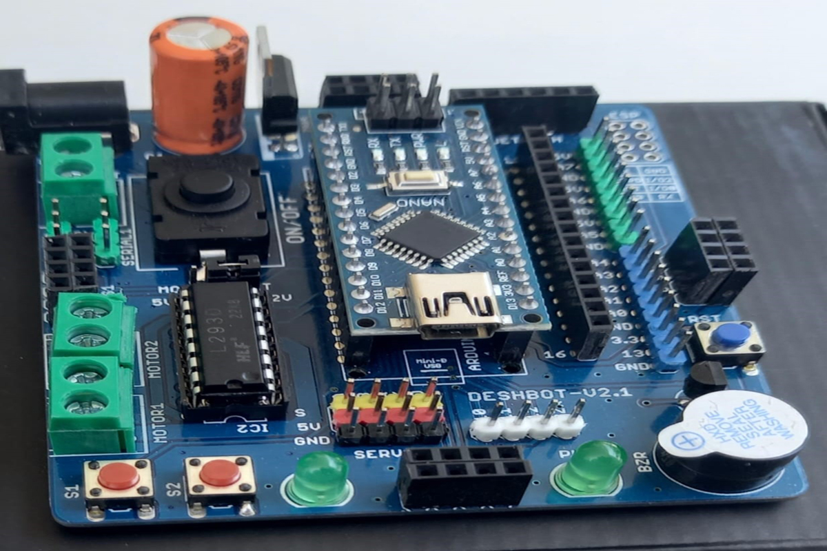 The Deshbot Robot Shield is an innovative educational tool designed to help students learn programming and robotics in a hands-on, engaging way. By integrating seamlessly with the Arduino platform, Deshbot provides a versatile foundation for building and controlling robots, allowing students to write and upload code to execute various tasks and behaviors. This shield includes a range of sensors and actuators, such as motors, LED indicators, and proximity sensors, which students can program to create responsive and interactive robotic systems. Through experimenting with Deshbot, students develop a deeper understanding of coding principles, electronic circuits, and mechanical design, fostering critical thinking, creativity, and problem-solving skills essential for future STEM pursuits.